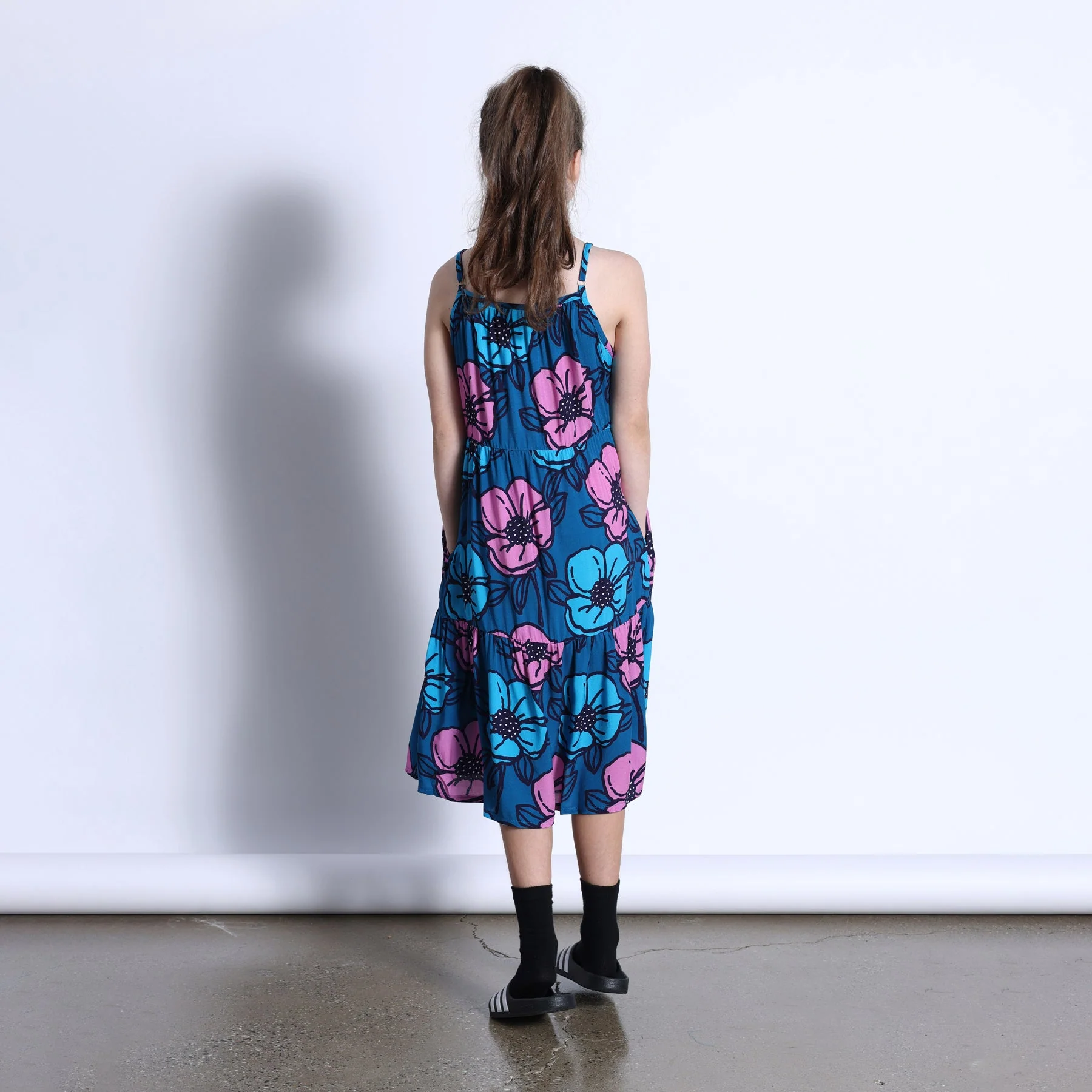 Super cool midi length rayon woven dress with adjustable straps, hidden side pockets and 3 panels separated by rouched seams. Digitally printed so super soft hand-feel. 100% Rayon.